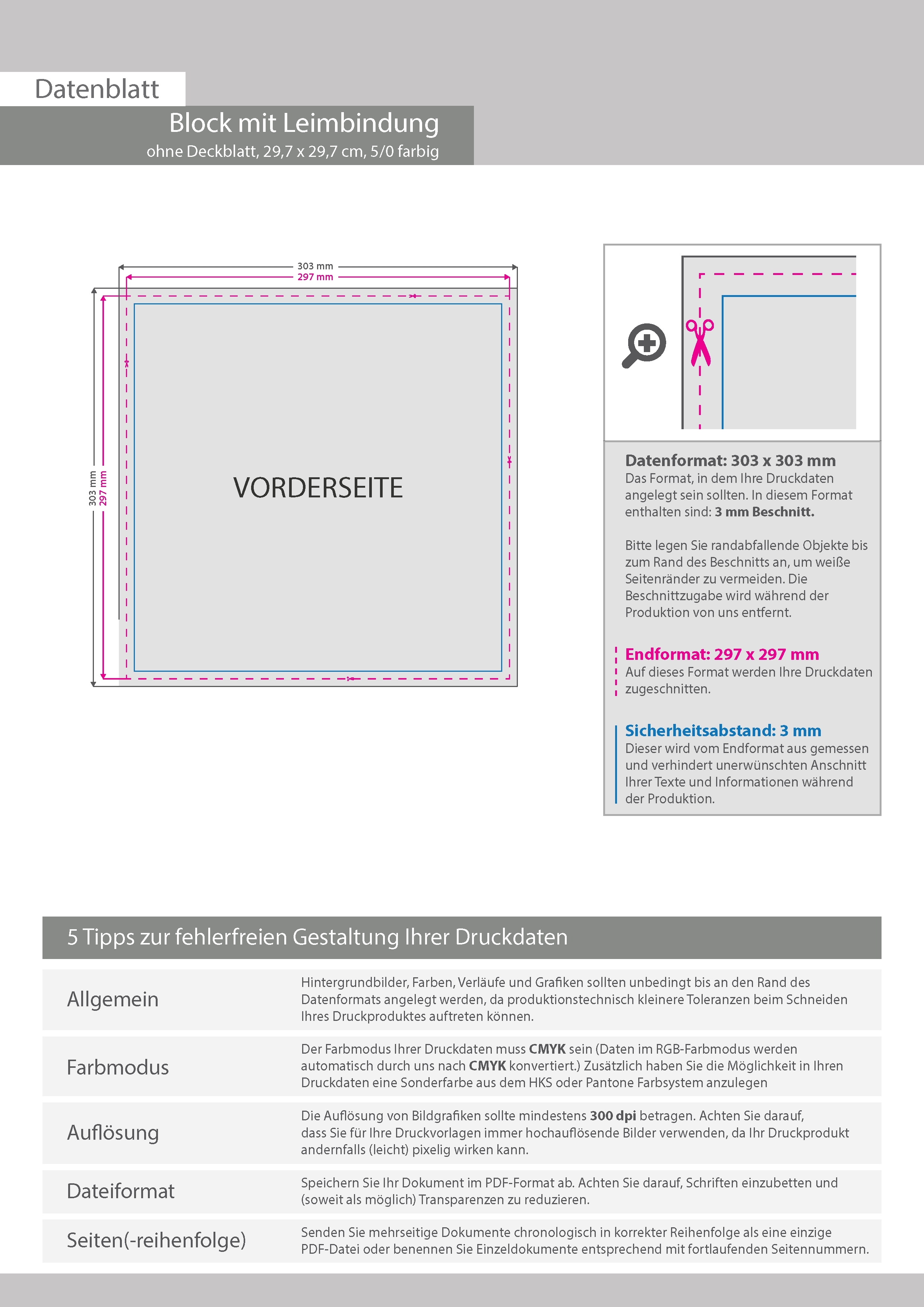 Block mit Leimbindung, 29,7 cm x 29,7 cm, 50 Blatt, 5/0 farbig einseitig bedruckt (CMYK 4-farbig + 1 Sonderfarbe HKS oder Pantone)