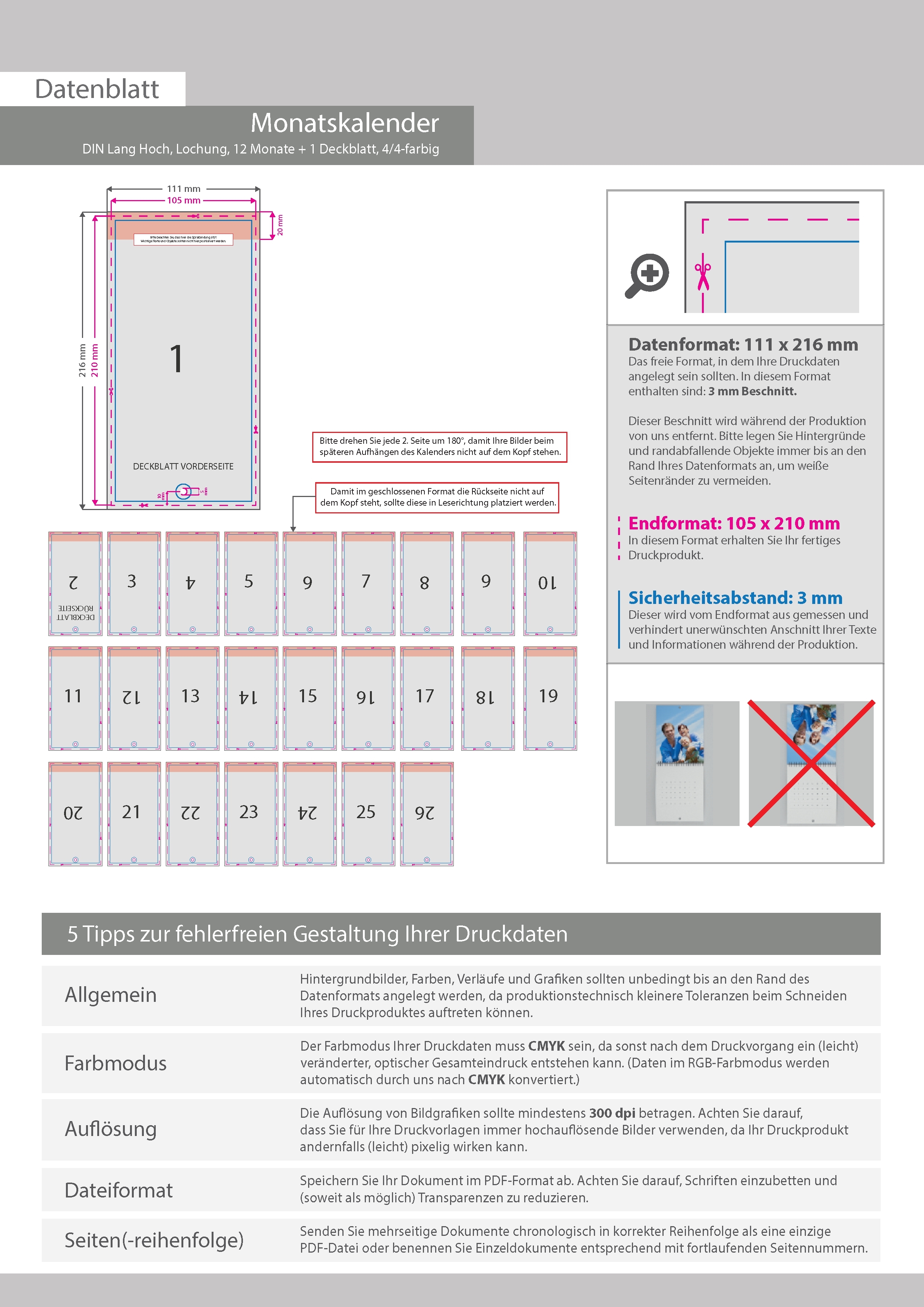 Monatskalender mit Lochung 13 Blatt (12 Monate + Deckblatt)