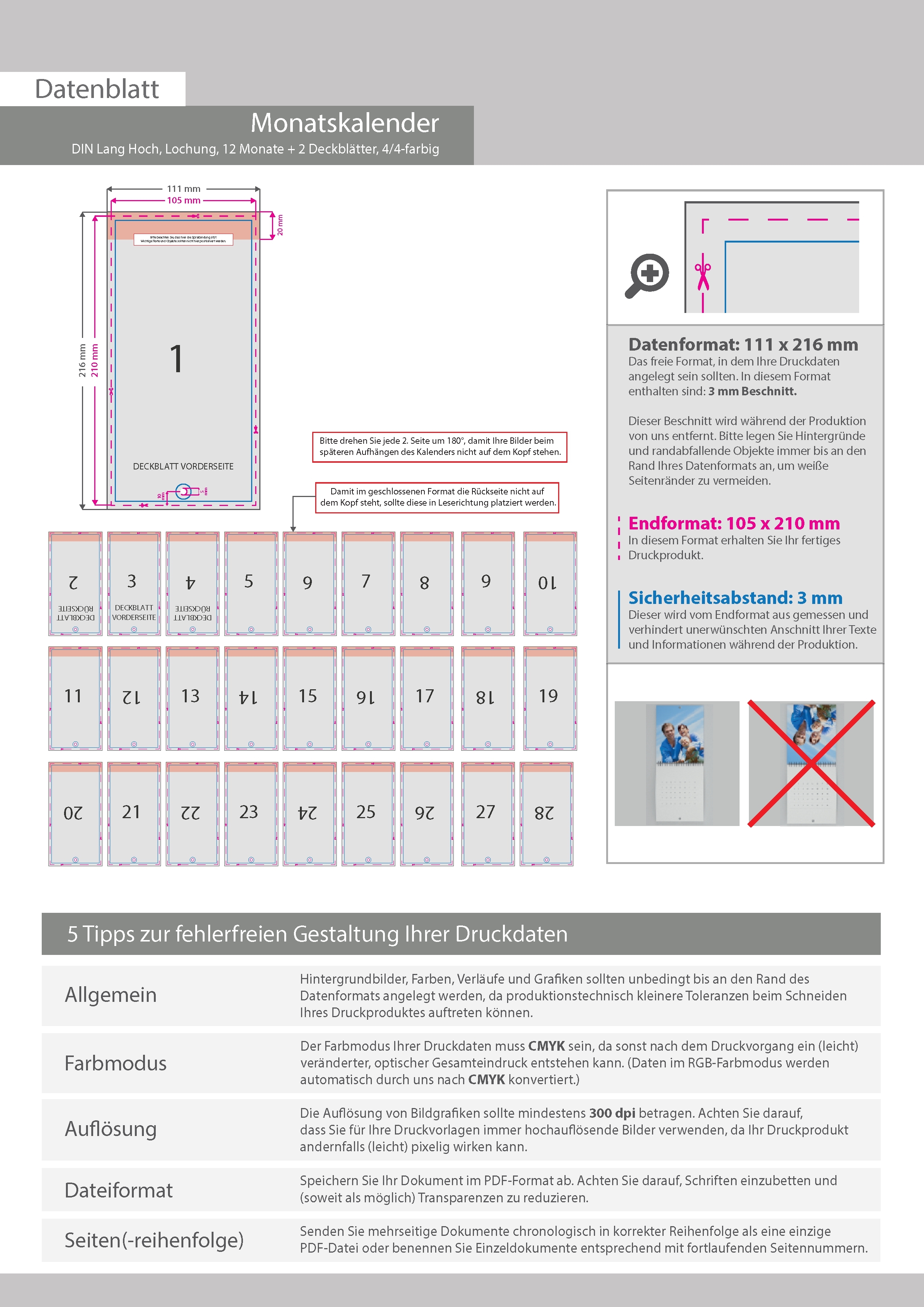 Monatskalender mit Lochung 14 Blatt (12 Monate + 2 Deckblätter)