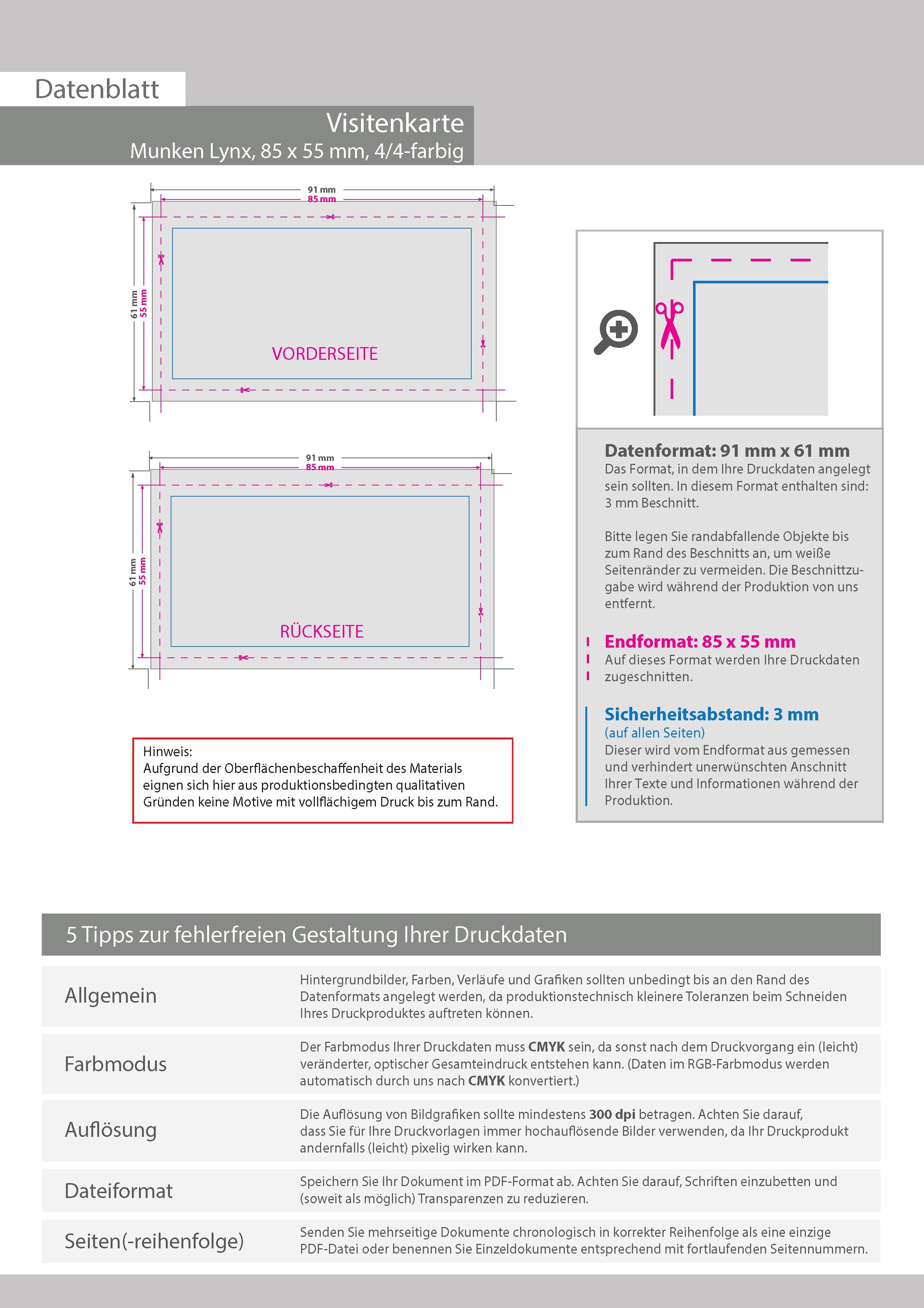 Visitenkarten quer 4/4 farbig 85 x 55 mm (beidseitiger Druck), Munken Lynx